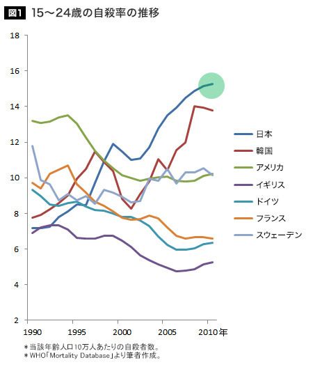 15~24歳の自殺率は、90年代以降ずっと上がり続けています。しかもそれは、日本の特徴のようです。図1をご覧ください。
