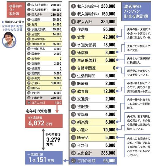 渡辺家は、しっかり者の妻が独身時代に貯めた880万円を元手に、月々の差額にボーナスを加えた月17万2000円を運用。21年間3%で運用すると7651万円に。夫婦の退職金を2500万円と見込めば、合計資産は1億151万円と大台を突破する。そんな渡辺家の家計簿もかつては火の車。夢見がちで金銭感覚の希薄な夫を、しっかり者の妻がサポートしていた。