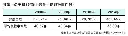 確かに、その後司法試験合格者は増え、弁護士数も急増したものの、思ったほど裁判や法律案件は増えなかった。その結果、表のように弁護士1人当たりの平均取扱事件数は減少し、収入減・所得減につながっているのです。