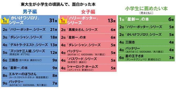 では、東大生たちは小学生のときにどんな本を読んできたのか。小学生時代に読んで面白かった本を5冊挙げてもらい、男女別に上位のものを集計したのが表だ。男子は上位から人気の児童書「かいけつゾロリ」シリーズ、「ハリー・ポッター」シリーズ、長編ファンタジー小説「ダレン・シャン」シリーズ。女子は1位「ハリー・ポッター」シリーズに続き、2位は同数で「黒魔女さん」シリーズ、「星新一」の本とSF小説が挙がった。