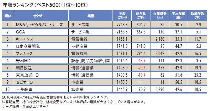 平均年収トップはM&Aキャピタルパートナーズ。中小企業の事業承継やM&A(企業の買収・合併)の仲介業務に特化し、成約1件ごとに得る手数料はおよそ6000万円。その3分1が担当の従業員の収入になるというのが、M&Aキャピタルパートナーズのビジネスモデルだ。個別ならともかく平均で2200万円超、それも平均年齢がおよそ30歳というのは過去に例がない高給といっていいだろう。16年9月期は1905万円平均と減額になったが、平均給与トップレベルである事実に変わりはない。経営トップも、16年9月期に年俸が1億9742万円と初めて1億円を突破し、個別開示の対象になった。