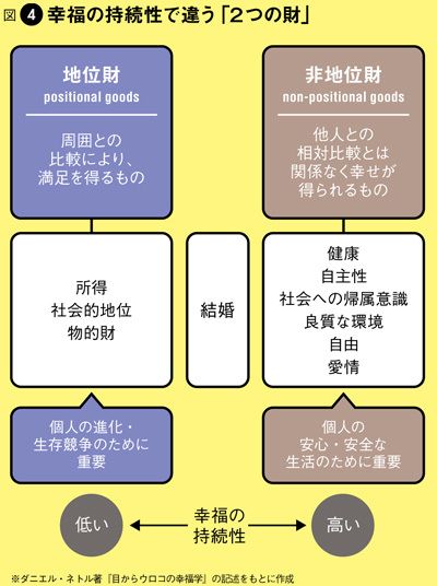 経済学者のロバート・フランクは周囲との比較で満足を得るものを「地位財」、他人との相対比較とは関係なく幸せが得られるものを「非地位財」と整理しました。「地位財」の具体例は、所得や貯蓄、役職などの社会的地位、家やクルマなどの物的財。一方の「非地位財」は、健康、自由、愛情などです。この2つの違いについて、心理学者のダニエル・ネトルは著書『目からウロコの幸福学』で、「幸福の持続性が異なる」と論じています(図4)。