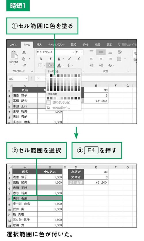 たとえば、出席表に記載された中からキャンセルが出たときは、該当するセルを選択し、セルを塗りつぶします。その後は[F4]を押すだけで、同じようにセルに色が塗りつぶすことができるのです。