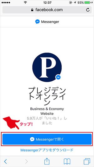 (2)ページが開いたら、「Messengerで開く」ボタンをタップしてください。