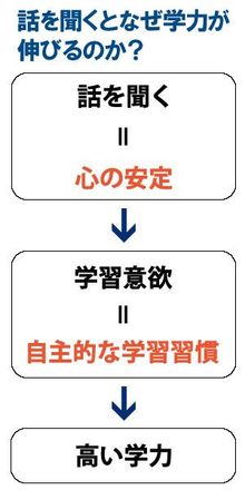 仙台市のデータでは、「話をしっかり聞いてもらった」子供は、「学習意欲」が力強く育っていくことがわかっている。学習意欲は、やがて「自主的な学習習慣」につながり、「高い学力」として結実する。