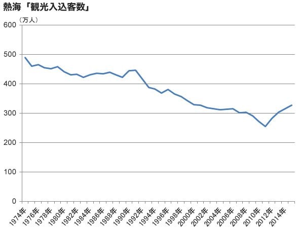 かつて熱海は人気の観光地だった。昭和の頃には新婚旅行の宿泊先にもよく選ばれ、やがて社員旅行などで団体客がたくさん訪れるようになった。だが、時代の変化と共に熱海は古臭い観光地として敬遠されるようになった。熱海市の統計資料を見ると、宿泊客数は1991年がピークで、1年で440万人以上の観光客が熱海に宿泊している。しかしその後宿泊客数は減少の一途をたどり、2002年からは300万人を割り込む事態に。特に東日本大震災が起きた2011年には246万人まで落ち込んだ。