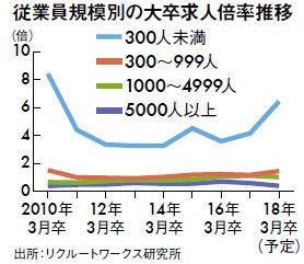 「3月卒の求人倍率は、企業の規模ごとでは従業員数5000人以上で0.39倍なのに対し、300人未満では6倍を上回ります。業種別でも金融業は0.19倍と人気ですが、流通業や建設業では10倍前後と大きな差が出ています。年々、その差が拡大し、二極化している。働きやすさや福利厚生の充実を求める最近の学生の気質を反映したものでしょう」