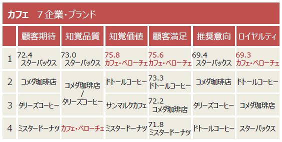 同調査では「顧客満足」を含む6つの指標がある。18年度の第1回調査結果では、「顧客満足」「知覚価値」「ロイヤルティ」の3指標でベローチェが1位となり、「顧客期待」「知覚品質」「推奨意向」の3指標でスターバックスコーヒーが1位となった。ベローチェとスタバが6指標の1位を独占したわけだ。