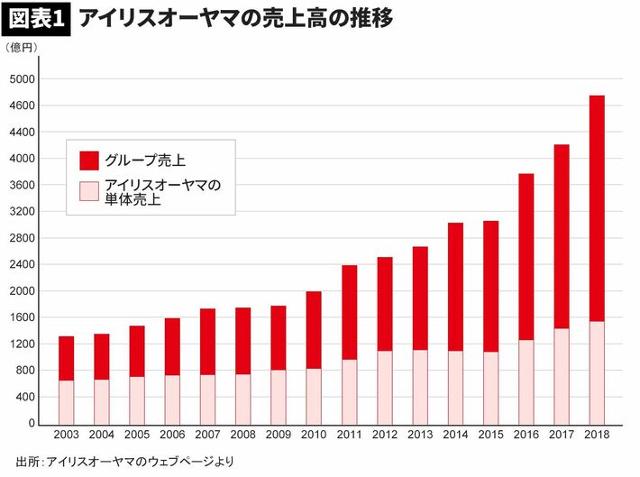 2018年度決算速報によると、アイリスオーヤマを含む25社のアイリスオーヤマグループの総売上高は4750億円と前年比113%、経常利益5.7%を確保できる見込みだ。アイリスオーヤマ単体でも売上高は1550億円で前年比113%となっている。