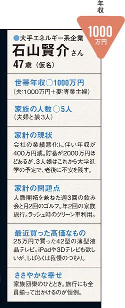 これが大手エネルギー系企業でコンサルティング業務に従事する石山賢介氏(仮名、47歳)の現況である。身なりに派手なところはない。ピンストライプのスーツとナイロン製の鞄は実用性の高さから選ばれたのだろう。澱むことなく的確に家計の実態を説明する様子からも、実務能力の高さがうかがえた。