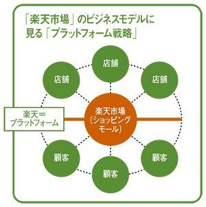 日本における代表例は、インターネット・ショッピングモールの「楽天市場」でしょう。ご存じのように、楽天自体がモノを売っているわけではなく、「楽天市場」という場に、モノを売りたい小売店をたくさん集めている(図参照)。