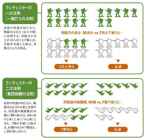 戦略実行に当たって、田岡らが援用したのが前述のランチェスター法則だ。これには「一騎打ちの法則(ランチェスターの1次法則)」と「集団戦闘の法則(ランチェスターの2次法則)」とがある(図参照)。
