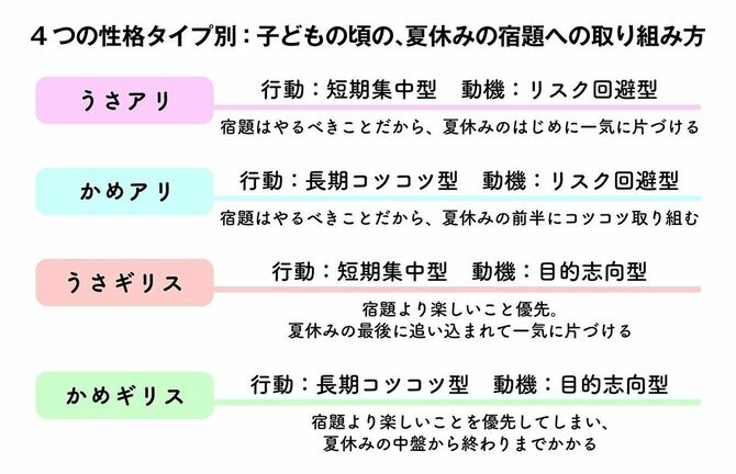 もっとシンプルに、大まかに4タイプで性格を分類し、業務への向き合い方やモチベーションの所在を考えられたら使いやすい。そう思ってまとめたのが、この「童話マトリックス」です。実は、この分類のヒントになったのは「子どもの頃の、夏休みの宿題への取り組み方」です。