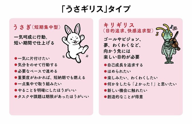 「うさギリス」タイプの人は、以下のうさぎの行動傾向とキリギリスの動機傾向を持っています。