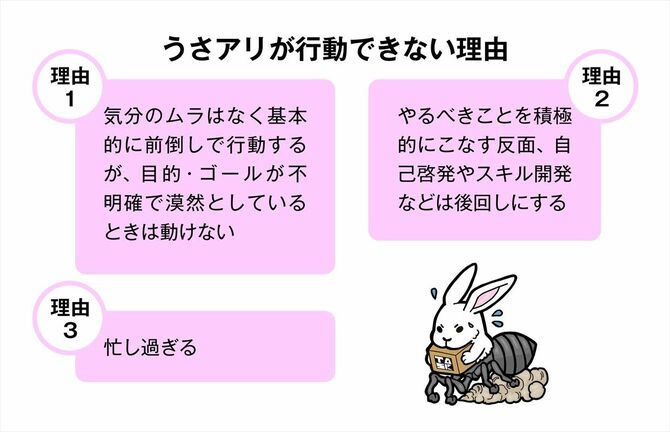 つねに目の前の仕事をバリバリこなす「うさアリ」タイプにとって、仕事の先延ばしは無縁に思えます。ですが、目的や目標、手段、ゴールが曖昧な案件には途端に手が止まってしまいます。