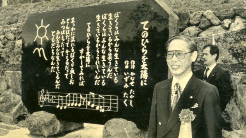 そして、冒頭のシーンのように、やなせが明かりに自分の手をかざしてみたことから、「手のひらを太陽に」の歌詞が生まれたことも事実である。それに、いずみが曲をつけ、紆余曲折を経て、現在では知らない人はいないというほどの国民的唱歌になった。