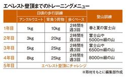 2年目は3キログラムずつ重しをつけ、20キログラムを背負い、週に3日、2時間歩く。富士山には年に10回ぐらい登る。その際に15キログラム程度の荷物を背負い、エベレスト登山に近い装備で歩く。さらにヒマラヤの5000メートル級の山をトレッキングする。