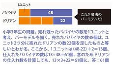 バーモデルとは、文章題の中で基準となる数をまず見極め、それを1ユニットとして、他の数との関連を図に表したもの(図参照)。未知の数値を未知のまま視覚化して、取り扱いやすくするのがミソ。日本では鶴亀算や旅人算などのテクニックや、方程式を使わなければ解けないような問題も、バーモデルを使えば比較的簡単に解けてしまう。