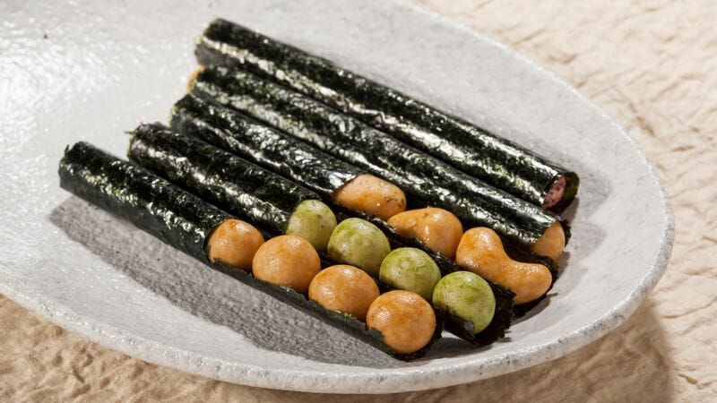 海苔を代表する贈答品として思い浮かぶ中に、「風雅巻き」はないだろうか。豆を海苔で巻いた棒状の、あのお菓子だ。パリッと頬張るごとに、磯の香りと豆の香ばしさが舌から鼻腔に広がり、品の良い自然の旨みに包まれる。親戚や知人に贈られて、職場で配られて。一度と言わず、二度、三度、口にしたことがあるという人も少なくないだろう。