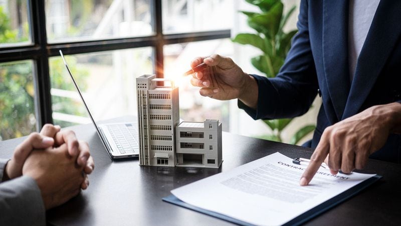 不動産取引に関する書類を説明する業者とそれを聞いている顧客