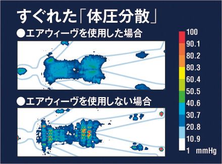 また、すぐれた体圧分散効果(図参照)にも注目したい。人間の背骨はゆるやかなS字カーブを描いており、寝そべったときには頭、肩、腰、脚の4カ所に体重が集中しやすくなる。その点、エアウィーヴはあらゆる方向から体を支えるため、圧力が偏ることなく、負荷をうまく分散させるというわけだ。