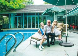中庭のプールを望む広々とした部屋から見渡すと、ロジャーズ氏はプールサイドでエクササイズに励んでいるところだった。ほどなく彼は額の汗を拭き拭き、出迎えてくれた。