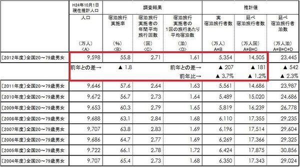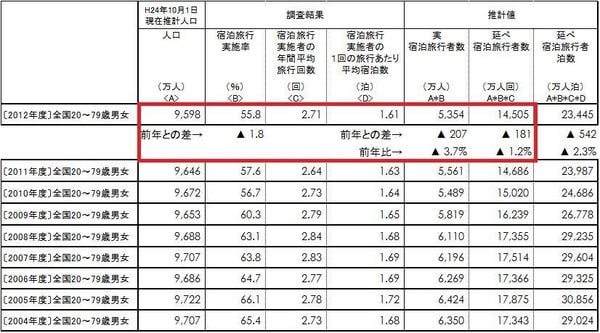 近年、国内旅行の市場は「若者離れ」が進んでいる。観光にまつわる調査・研究を行なうリクルートじゃらんリサーチセンターによると、2012年の延べ旅行者数は14505万人。 そのうちの5割以上は50歳を超えた世代が占めているという。また、世代別の旅行実施率(2012年と2011年を比較)をみると、20~34歳の実施率は3.1%減と、全体平均の1.8%減を大きく上回った。調査結果に対し、少子化なので当然ではないか、と疑問を覚える人も少なく無いと思うが、人口増減率は平成24年全体で-0.2% である事からも、単純に少子化で片付けることはできない。
