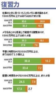 「仕事のときに気づいたことや学んだことを、メモに書き留める習慣がある」「そのメモをあとから見返して確認する習慣がある」について、1500万円以上のほうが習慣化している割合が高かった。
