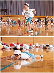 かけ声が終わって鬼が振り向いたとき、床に伏せていればセーフ、間に合わなければアウト、というアレンジがミソ。伏せてはさっと起き上がって走り、また伏せては起き上がって……と繰り返す運動量はかなりのもの。