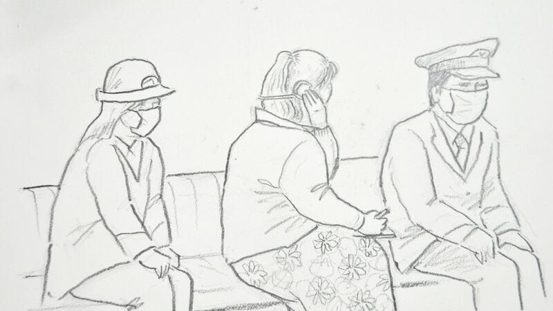 2009年に男性2人が変死した鳥取連続不審死事件の控訴審判決。補聴器に手を当てながら判決に聞き入る上田美由紀被告(中央)=2014年3月20日午前、島根県松江市の広島高裁松江支部[代表スケッチ]