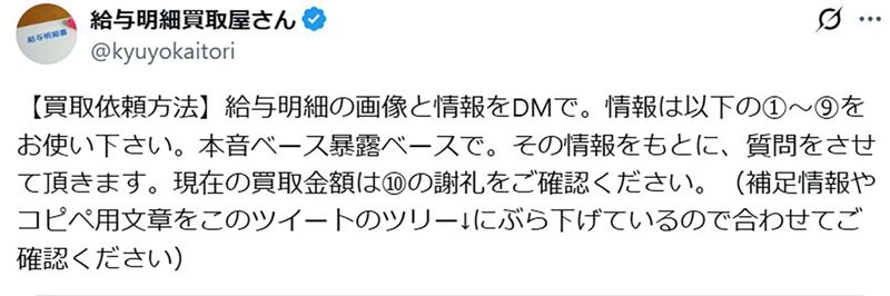 Xで10万人以上のフォロワーを持つ「給与明細買取屋さん」。“ホワイト企業を次世代に”を掲げて2021年から活動を開始、4年間で約1100人の給与明細を買い取り、令和の知られざる給与事情をXとブログで明かしている。