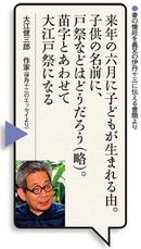 来年の6月に子どもが生まれる由。子供の名前に、戸祭などはどうだろう、という。苗字とあわせて大江戸祭になる、というのだ。ふざけた男である。