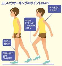 正しい歩き方のポイントは、重心をやや前ぎみに、足を踏み出す際にひざをいつもより高く上げる。ひざは緩め、足裏全体で(かかと、足の5本の指の付け根、足の5本の指先で受け身をつくって)着地する感覚。