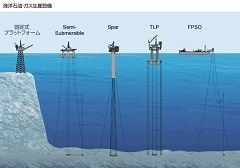 ポイントは、洋上の生産設備と開発体制だ。まず生産設備については、ハイドレート由来のガスも既存の天然ガスも主成分はメタンなので、従来の海底油田・ガス田の開発技術が応用できる。現在、世界の海洋における石油、ガスの生産設備には次のようなものがある。