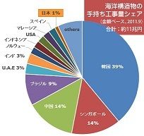 じつは、これまで述べてきた海洋資源開発の分野で、日本は韓国や中国、シンガポールに大きく水をあけられている。後塵を拝せないほど距離が開いているのだ。「第16回パッケージ型インフラ海外展開関係大臣会合」に提出された資料によれば、海洋構造物の建造シェアは韓国が約4割、シンガポール、中国がそれぞれ14%、ブラジル9%ときて、日本はわずか1%。過去10年間、日本のメーカーは1基も海底の構造物を建造していない。造船技術があっても本格的な海洋構造物は造れない。大水深での生産設備の係留や設置工事の実績もない。そもそもこれまでは日本周辺には海洋開発の案件がなかったのである。