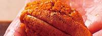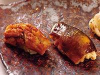 【3】主人の岡正勝さん曰く「ウニのスープを握る感じ」という、ムラサキウニの握り。崩れやすいため、手渡しで供される。口の中いっぱいに磯の香りが広がる。