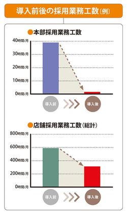 応募者情報が集約されることで、本部による取りまとめなどが不要となり、各店舗の直接対応を促進。導入企業のなかには、本部の採用業務工数はほぼ「ゼロ」に、店舗の採用業務工数は半減した例もある。