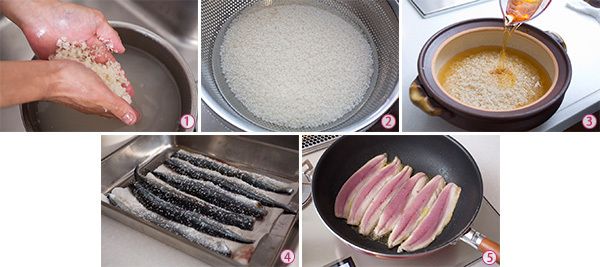 (6)炊き上がった(3)に(5)のサンマの身部分を下にして並べ入れ、5分ほど蒸らす。