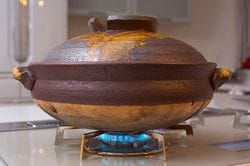(3)土鍋に(2)とAを入れて蓋をし、中火強で加熱する。沸騰したら中火で2分、弱火7分、ごく弱火で5分炊く。