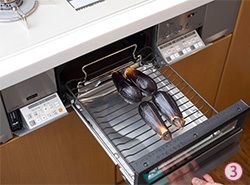 (3)茄子はがくを取り、皮目に縦に7~8本の切り目を入れる。両面焼き水なしグリルに並べ入れ、強火で10分焼く。