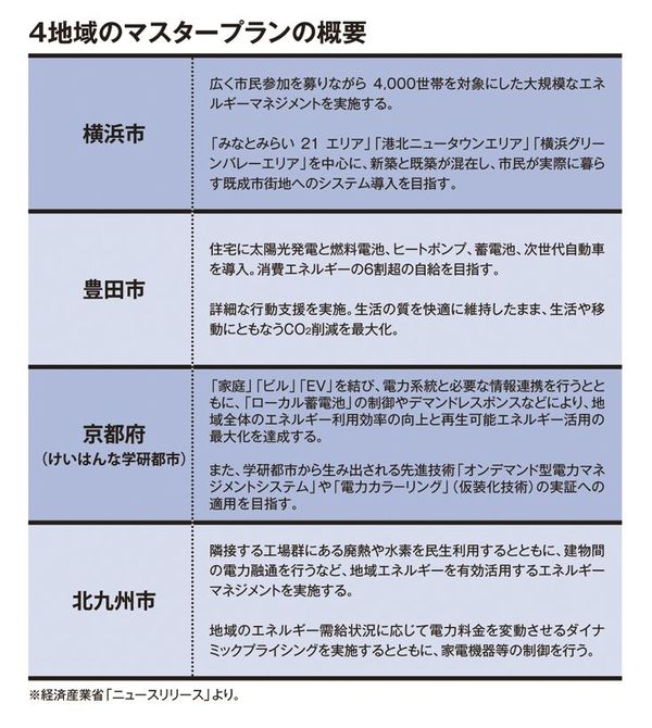 また、同じ2010年には経済産業省による「次世代エネルギー・社会システム実証事業」もスタートしている。これは、産業、住民、自治体などが一体となって取り組みに参加し、実際の「地域」でスマートコミュニティの実現を目指した実証試験を行うもの。全国からの提案応募に基づき4地域(横浜市、豊田市、京都府[けいはんな学研都市]、北九州市)が選ばれ、具体的な取り組みが推進されている。今年になってこの実証事業の成果が報告され始めているのである。