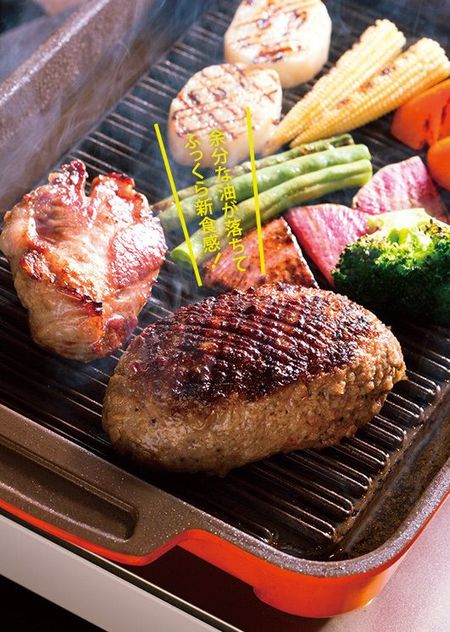 一回の加熱で、ハンバーグと豚肉、数種類の野菜を、素材のもつ水分で焼き上げる。もちろん、肉や野菜の内容を替える、肉と魚のミックスグリルにする……もOK。セラミックヘルシーロースターなら同時調理も簡単。