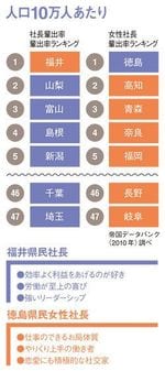 一方、徳島女は、明るく働き者で活動的、経済観念が発達しており、気も強い。徳島藩が藍や葉たばこなどの栽培を奨励し、それを京阪神地方に売りにいったのが阿波商人のはじまり。これが何代にもわたって続いため、大阪商人的気質が強いのが特徴。この阿波商人をルーツに持ち、日常生活においても買い物上手な徳島女だからこそ女社長輩出率1位も当然?