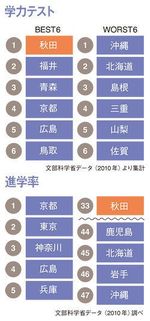秋田の子どもたちは学年が上がるのにつれて、学力が伸びなくなるといわれる。小中学校の学力テストでは、周りがおだててのせればいい成績をとれるが、高校からはそうもいかない。秋田は高校受験には熱心だが、大学進学に関してはそれほどでもない。これは、親の世代に大卒者が少ないことも原因らしい。ゆえに、親も子どもの大学進学を望んでいないし、地元の会社求人も大卒者にこだわらないので、子どもは大学進学の意義が見いだせないのだ。