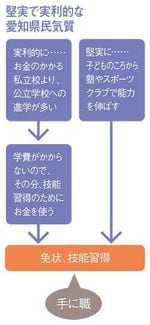 しかし、習い事に通うにはお金がかかる。ケチな名古屋市民を有する愛知では公立校に対する信用度がとても高く、高い授業料を払って私立校へ行かせる必要はないと考える親が多い。授業料が安い分、習い事にお金を回せるというわけだ。