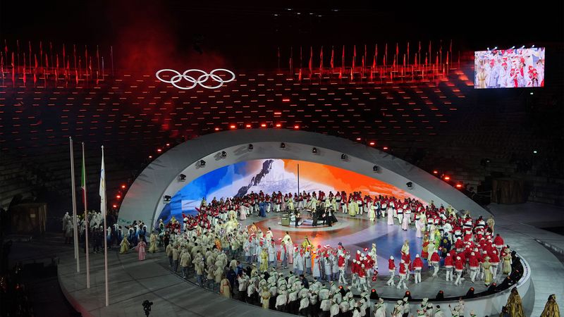 閉会式の総括コンセプトは「Beauty in Action(美の躍動)」であった。極限状態において露わになる身体の動き、その緊張と解放の瞬間に宿る美を、芸術・文化・精神の次元と統合するという構想である。しかしそれは単なる身体賛歌ではない。ヴェローナ・アリーナという、かつて剣闘士が血を流した円形闘技場を舞台に、透明な衣装の歌手が『地獄篇』最終行「そして私たちは星々を再び見るために外へ出た」を歌い上げるとき、そこには明確な物語的意図があった。地獄から星へという構図は偶然ではなく、分断と苦難を通過した世界が、なお上昇可能であるという宣言であった。