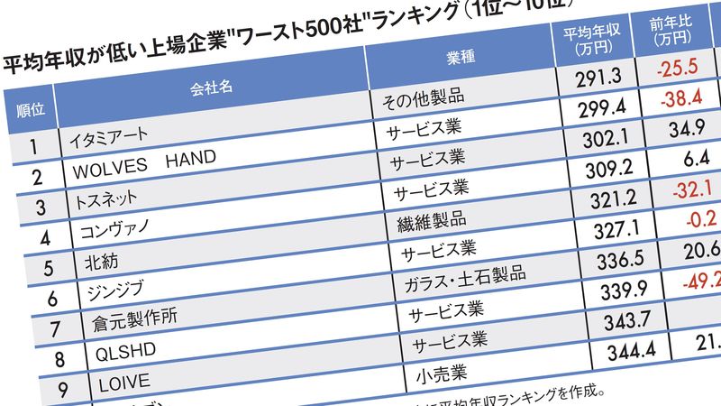 調査対象会社は、上場企業のうち単体の従業員数が10人未満の企業や、平均賃金の発表がない企業などを除いた3709社。このうちワースト500社に該当する企業の平均年収は447.8万円だった。