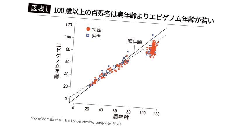 老化の起こるメカニズムは何か。同志社大学生命医科学部アンチエイジングリサーチセンターの米井嘉一さんは「最新の研究で細胞の年齢を計測しようと『メチル化年齢』を計測すると、100歳以上の百寿者に近づくほど、暦年齢よりメチル化年齢が若かった。また、糖尿病患者のほうが早く老化することもわかっていて、病的な老化の正体は糖化だといえる」という――。