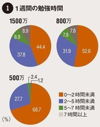 1週間の勉強時間を質問したところ、年収500万円台、800万円台は2時間未満という回答が過半数に。1500万円台だけが、2時間以上勉強している人のほうが多かった(図1)。