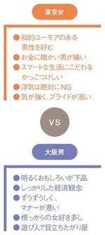 東京女はプライドが高く、意地っ張りのかっこつけしいなので、大阪男の生活感のある暮らしぶりや価値観、店でいきなり値切り交渉を始めるデリカシーのなさにドン引きしてしまう。また、東京女の父親をはじめ、小さなころから細かな気づかいのできる東京男にかしずかれてきたので、自己中心的で気配りのできない大阪男と相容れることができない。
